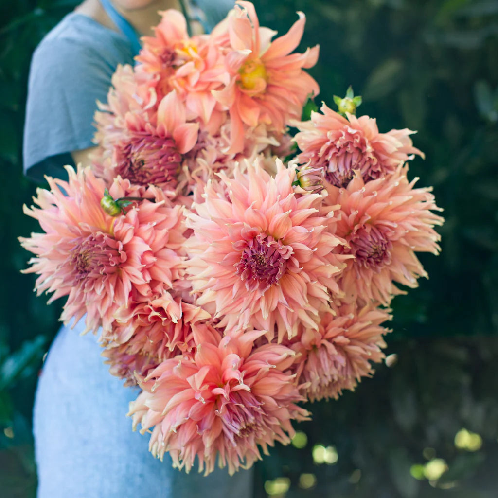 The Fairway Spur Dahlia is a true garden treasure, celebrated for its enormous, dinnerplate-sized blooms that can reach up to 10 inches across. Its petals unfurl in shades of glowing coral-pink, peach, and soft apricot, creating a radiant, sun-kissed display that feels both cheerful and romantic.